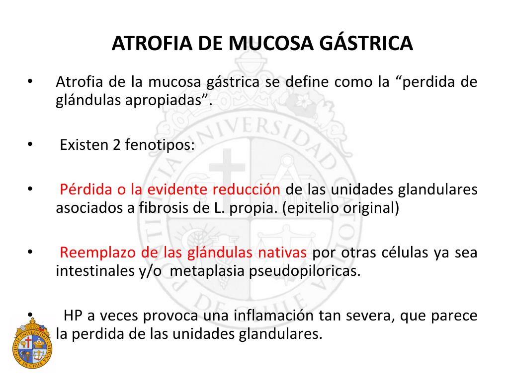 Atrofia de la mucosa gástrica se define como la “perdida de glándulas apropiadas”. Existen 2 fenotipos: Pérdida o la evidente reducción de las unidades glandulares asociados a fibrosis de L. propia. (epitelio original) Reemplazo de las glándulas nativas por otras células ya sea intestinales y/o metaplasia pseudopiloricas. HP a veces provoca una inflamación tan severa, que parece la perdida de las unidades glandulares. ATROFIA DE MUCOSA GÁSTRICA