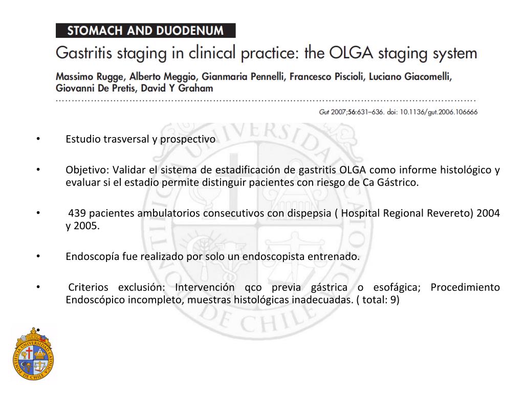 Estudio trasversal y prospectivo Objetivo: Validar el sistema de estadificación de gastritis OLGA como informe histológico y evaluar si el estadio permite distinguir pacientes con riesgo de Ca Gástrico. 439 pacientes ambulatorios consecutivos con dispepsia ( Hospital Regional Revereto) 2004 y 2005. Endoscopía fue realizado por solo un endoscopista entrenado. Criterios exclusión: Intervención qco previa gástrica o esofágica; Procedimiento Endoscópico incompleto, muestras histológicas inadecuadas. ( total: 9)