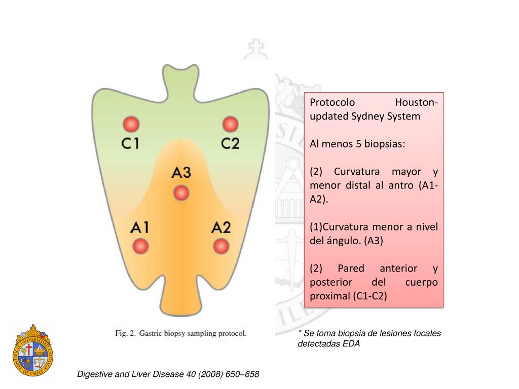 Protocolo Houston- updated Sydney System • Al menos 5 biopsias: • (2) Curvatura mayor y menor distal al antro (A1-A2). • Curvatura menor a nivel del ángulo. (A3) • (2) Pared anterior y posterior del cuerpo proximal (C1-C2) * Se toma biopsia de lesiones focales detectadas EDA Digestive and Liver Disease 40 (2008) 650–658