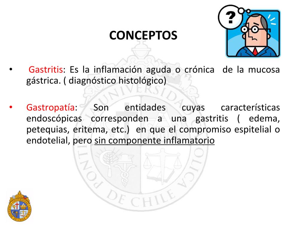 Gastritis: Es la inflamación aguda o crónica de la mucosa gástrica. ( diagnóstico histológico) Gastropatía: Son entidades cuyas características endoscópicas corresponden a una gastritis ( edema, petequias, eritema, etc.) en que el compromiso espitelial o endotelial, pero sin componente inflamatorio CONCEPTOS