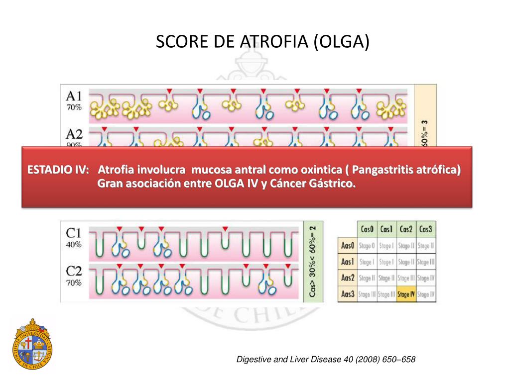 SCORE DE ATROFIA (OLGA) ESTADIO II: Atrofia puede ser en mucosa mucosecretora y/o oxintica. Es más frecuente en biopsias del área mucosecretor. Es el grado mas representado en poblaciones de bajo riesgo CG. Digestive and Liver Disease 40 (2008) 650–658