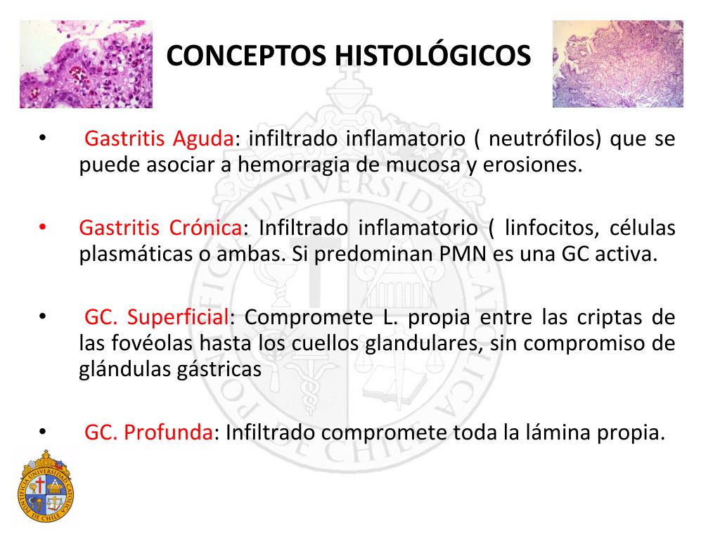 Gastritis Aguda: infiltrado inflamatorio ( neutrófilos) que se puede asociar a hemorragia de mucosa y erosiones. Gastritis Crónica: Infiltrado inflamatorio ( linfocitos, células plasmáticas o ambas. Si predominan PMN es una GC activa. GC. Superficial: Compromete L. propia entre las criptas de las fovéolas hasta los cuellos glandulares, sin compromiso de glándulas gástricas GC. Profunda: Infiltrado compromete toda la lámina propia. CONCEPTOS HISTOLÓGICOS