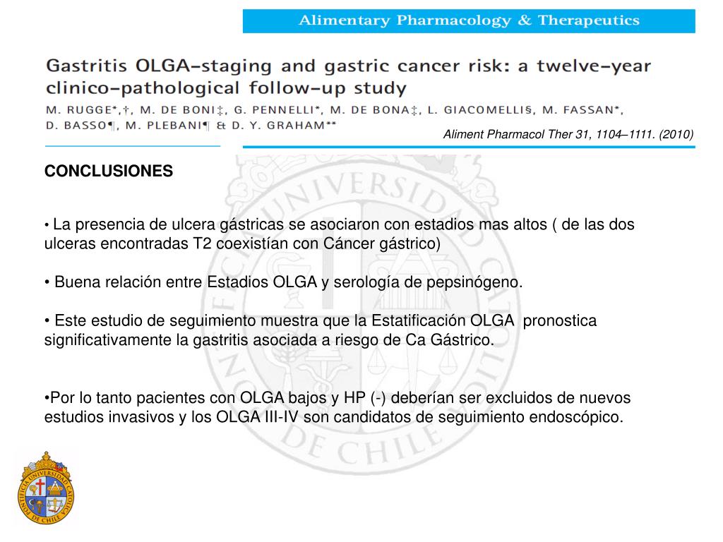 Aliment Pharmacol Ther 31, 1104–1111. (2010) • CONCLUSIONES • La presencia de ulcera gástricas se asociaron con estadios mas altos ( de las dos ulceras encontradas T2 coexistían con Cáncer gástrico) • Buena relación entre Estadios OLGA y serología de pepsinógeno. • Este estudio de seguimiento muestra que la Estatificación OLGA pronostica significativamente la gastritis asociada a riesgo de Ca Gástrico. • Por lo tanto pacientes con OLGA bajos y HP (-) deberían ser excluidos de nuevos estudios invasivos y los OLGA III-IV son candidatos de seguimiento endoscópico.