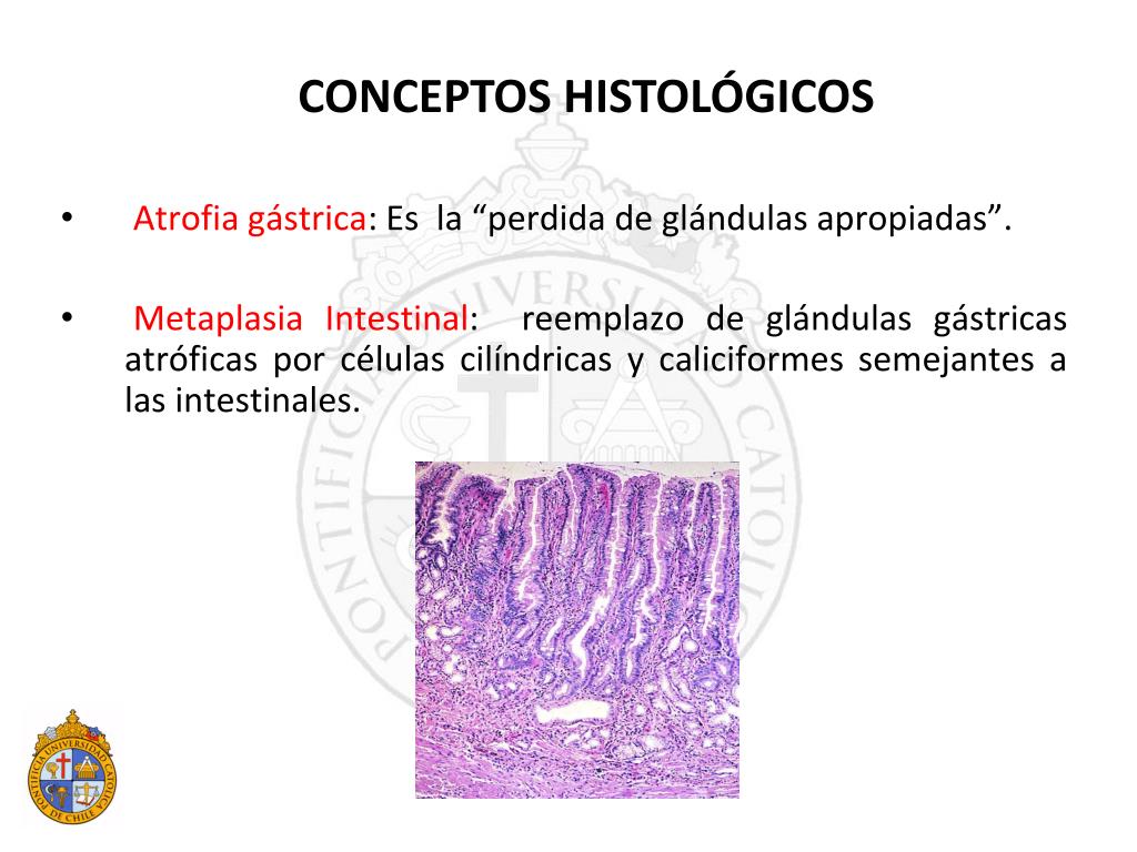 Atrofia gástrica: Es la “perdida de glándulas apropiadas”. Metaplasia Intestinal: reemplazo de glándulas gástricas atróficas por células cilíndricas y caliciformes semejantes a las intestinales. CONCEPTOS HISTOLÓGICOS