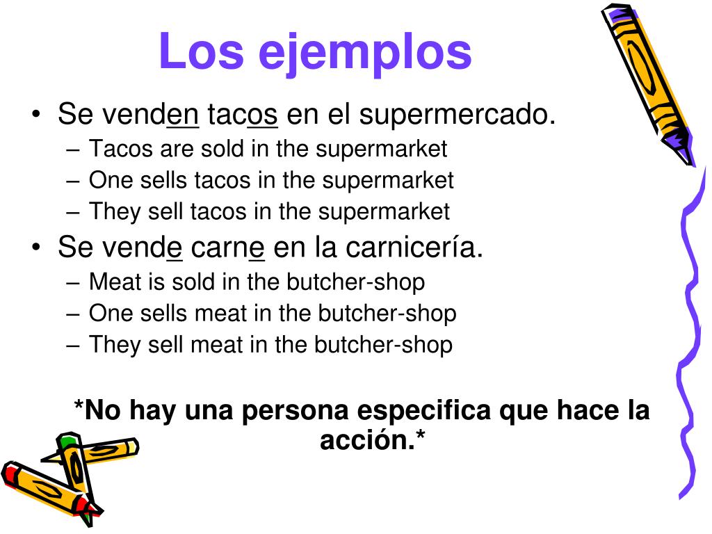 Los ejemplos • Se venden tacos en el supermercado. • Tacos are sold in the supermarket • One sells tacos in the supermarket • They sell tacos in the supermarket • Se vende carne en la carnicería. • Meat is sold in the butcher-shop • One sells meat in the butcher-shop • They sell meat in the butcher-shop *No hay una persona especifica que hace la acción.*