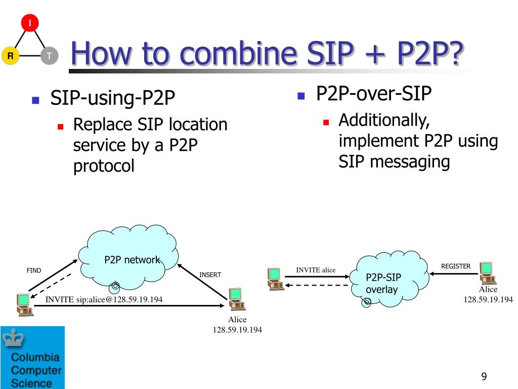 SIP-using-P2P Replace SIP location service by a P2P protocol P2P-over-SIP Additionally, implement P2P using SIP messaging How to combine SIP + P2P? P2P network REGISTER INVITE alice FIND INSERT P2P-SIP overlay Alice 128.59.19.194 INVITE sip:alice@128.59.19.194 Alice 128.59.19.194