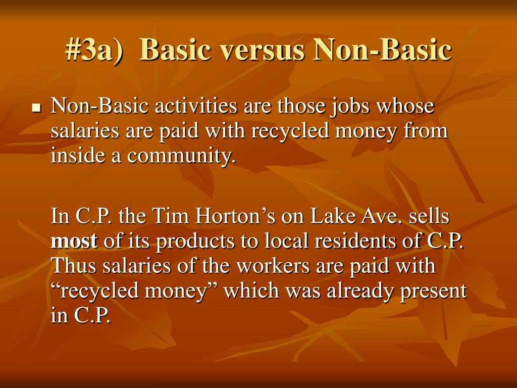 #3a) Basic versus Non-Basic Non-Basic activities are those jobs whose salaries are paid with recycled money from inside a community. In C.P. the Tim Horton’s on Lake Ave. sells most of its products to local residents of C.P. Thus salaries of the workers are paid with “recycled money” which was already present in C.P.