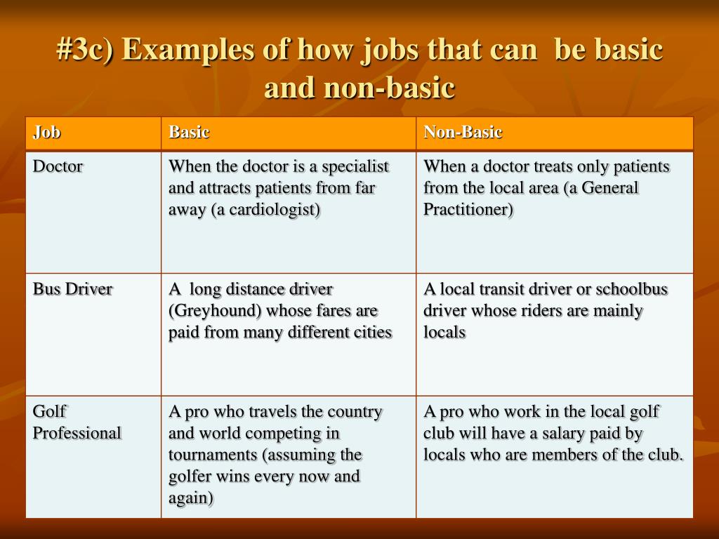#3b) Examples of basic and non-basic jobs A Ford factory worker is basic since the cars will be sold across N. America. A Firefighter is paid through local taxes paid by the residents of the town, city, county etc… A wheat farmer is Saskatchewan is basic since most of the wheat will be sold outside of the local market. The illustrator for this textbook is a basic job since the book is sold throughout Ontario.