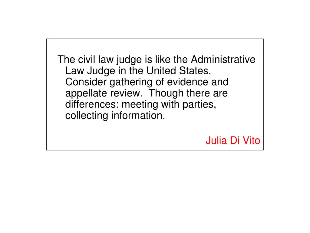 The civil law judge is like the Administrative Law Judge in the United States. Consider gathering of evidence and appellate review. Though there are differences: meeting with parties, collecting information. Julia Di Vito