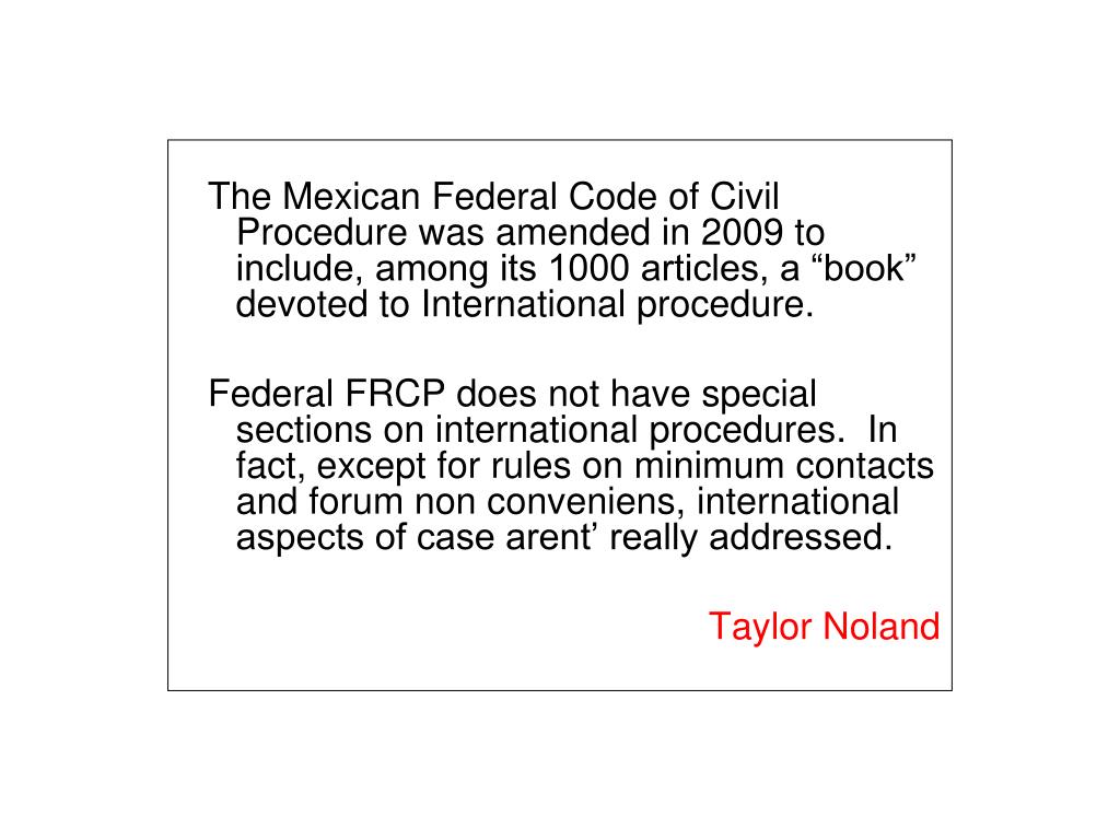 The Mexican Federal Code of Civil Procedure was amended in 2009 to include, among its 1000 articles, a “book” devoted to International procedure. Federal FRCP does not have special sections on international procedures. In fact, except for rules on minimum contacts and forum non conveniens, international aspects of case arent’ really addressed. Taylor Noland