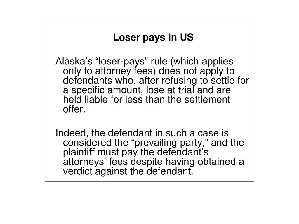 Loser pays in US Alaska’s “loser-pays” rule (which applies only to attorney fees) does not apply to defendants who, after refusing to settle for a specific amount, lose at trial and are held liable for less than the settlement offer. Indeed, the defendant in such a case is considered the “prevailing party,” and the plaintiff must pay the defendant’s attorneys’ fees despite having obtained a verdict against the defendant.