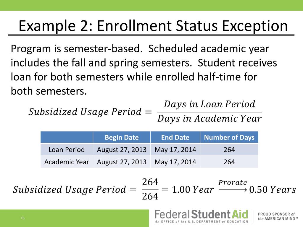 Subsidized Usage Period A Subsidized Usage Period is the period of time for which a borrower receives a Direct Subsidized Loan. • Calculated loan-by-loan • Measured in academic years or portions • Rounded down to nearest quarter of a year • Includes only periods when Direct Subsidized Loan received • ED will calculate using school-reported information