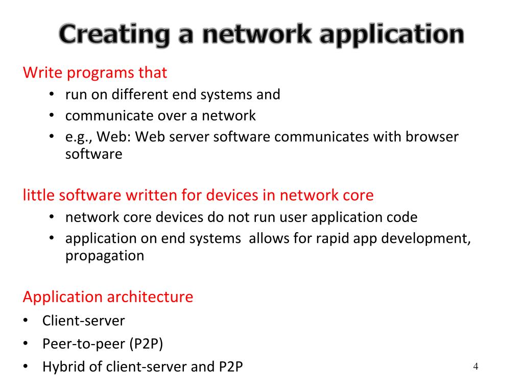 Creating a network application Write programs that • run on different end systems and • communicate over a network • e.g., Web: Web server software communicates with browser software little software written for devices in network core • network core devices do not run user application code • application on end systems allows for rapid app development, propagation Application architecture • Client-server • Peer-to-peer (P2P) • Hybrid of client-server and P2P
