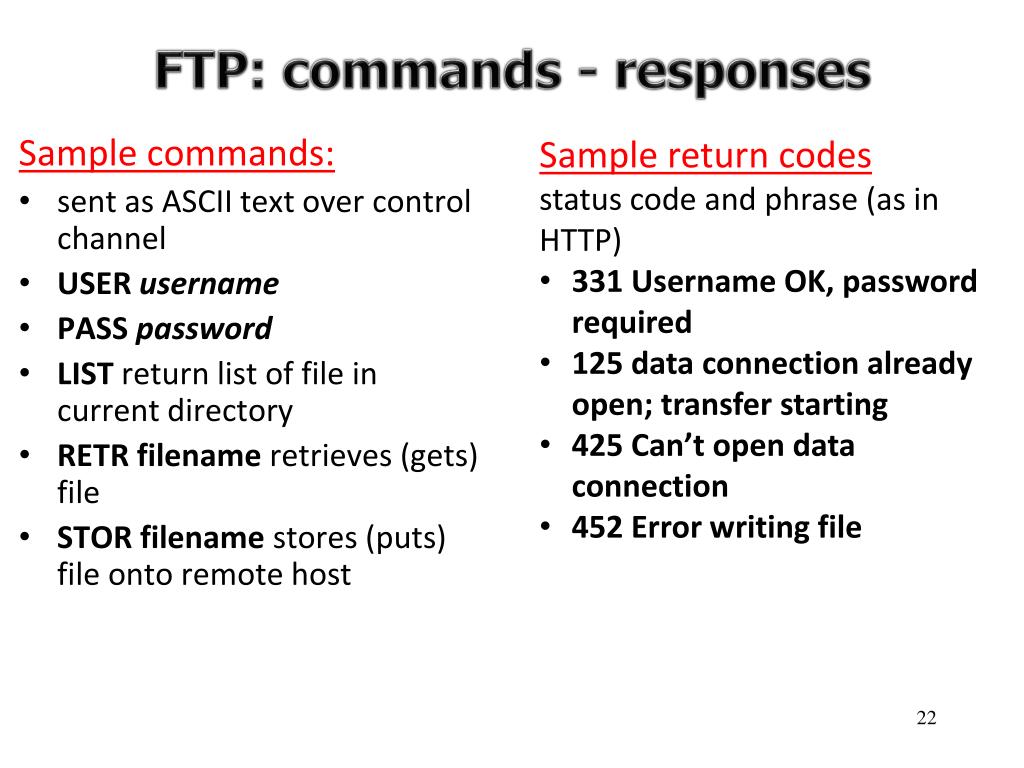FTP: commands - responses Sample return codes • status code and phrase (as in HTTP) • 331 Username OK, password required • 125 data connection already open; transfer starting • 425 Can’t open data connection • 452 Error writing file Sample commands: • sent as ASCII text over control channel • USER username • PASS password • LIST return list of file in current directory • RETR filename retrieves (gets) file • STOR filename stores (puts) file onto remote host