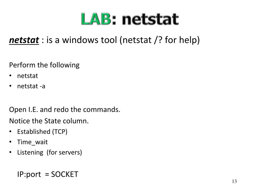 LAB: netstat netstat : is a windows tool (netstat /? for help) Perform the following • netstat • netstat -a Open I.E. and redo the commands. Notice the State column. • Established (TCP) • Time_wait • Listening (for servers) IP:port = SOCKET