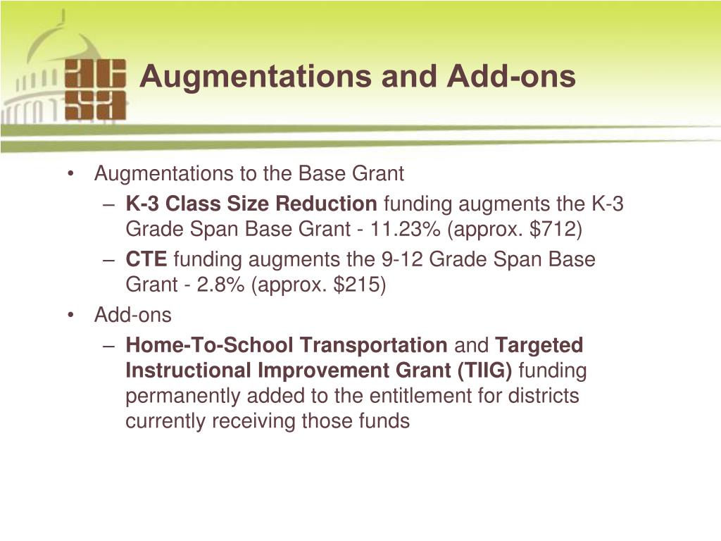 Augmentations and Add-ons • Augmentations to the Base Grant • K-3 Class Size Reduction funding augments the K-3 Grade Span Base Grant - 11.23% (approx. $712) • CTE funding augments the 9-12 Grade Span Base Grant - 2.8% (approx. $215) • Add-ons • Home-To-School Transportation and Targeted Instructional Improvement Grant (TIIG) funding permanently added to the entitlement for districts currently receiving those funds 877.954.4357 • www.sia-us.com 6