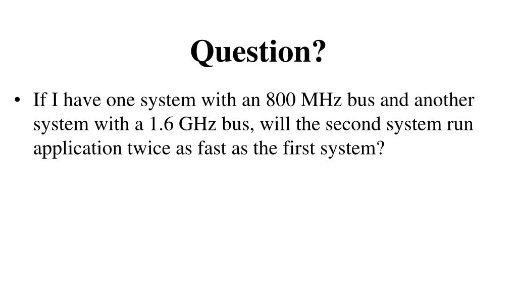 Question? • If I have one system with an 800 MHz bus and another system with a 1.6 GHz bus, will the second system run application twice as fast as the first system?