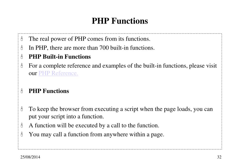 PHP Functions • The real power of PHP comes from its functions. • In PHP, there are more than 700 built-in functions. • PHP Built-in Functions • For a complete reference and examples of the built-in functions, please visit our PHP Reference. • PHP Functions • To keep the browser from executing a script when the page loads, you can put your script into a function. • A function will be executed by a call to the function. • You may call a function from anywhere within a page.