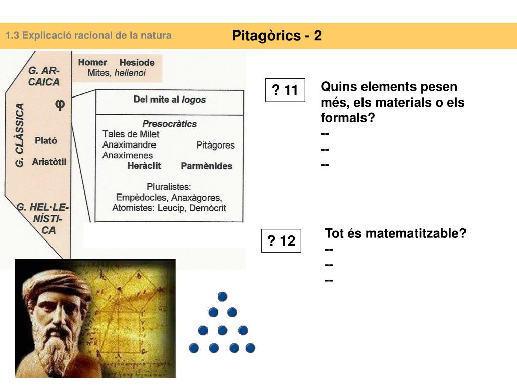 1.3 Explicació racional de la natura Pitagòrics - 2 Quins elements pesen més, els materials o els formals? -- -- -- ? 11 Tot és matematitzable? -- -- -- ? 12