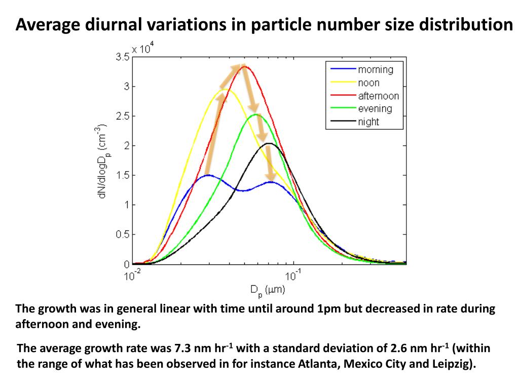 Average diurnal variations in particle number size distribution The growth was in general linear with time until around 1pm but decreased in rate during afternoon and evening. The average growth rate was 7.3 nm hr-1 with a standard deviation of 2.6 nm hr-1 (within the range of what has been observed in for instance Atlanta, Mexico City and Leipzig).