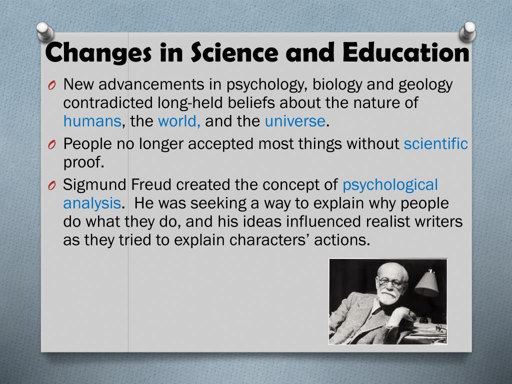 Changes in Science and Education • New advancements in psychology, biology and geology contradicted long-held beliefs about the nature of humans, the world, and the universe. • People no longer accepted most things without scientific proof. • Sigmund Freud created the concept of psychological analysis. He was seeking a way to explain why people do what they do, and his ideas influenced realist writers as they tried to explain characters’ actions.