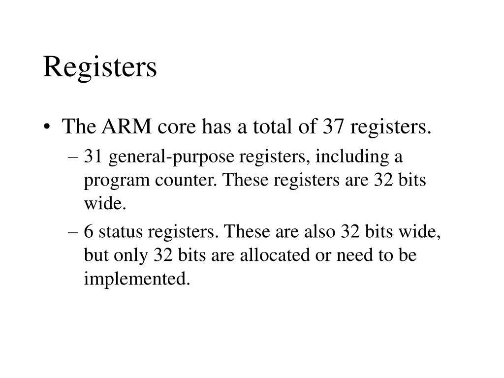 Registers • The ARM core has a total of 37 registers. • 31 general-purpose registers, including a program counter. These registers are 32 bits wide. • 6 status registers. These are also 32 bits wide, but only 32 bits are allocated or need to be implemented.