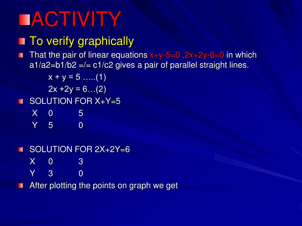 ACTIVITY • To verify graphically • That the pair of linear equations x+y-5=0 ,2x+2y-6=0 in which a1/a2=b1/b2 =/= c1/c2 gives a pair of parallel straight lines. x + y = 5 …..(1) 2x +2y = 6…(2) • SOLUTION FOR X+Y=5 X 0 5 Y 5 0 • SOLUTION FOR 2X+2Y=6 X 0 3 Y 3 0 • After plotting the points on graph we get