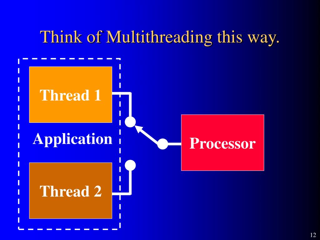 Think of Multithreading this way. Thread 1 Processor Application Thread 2