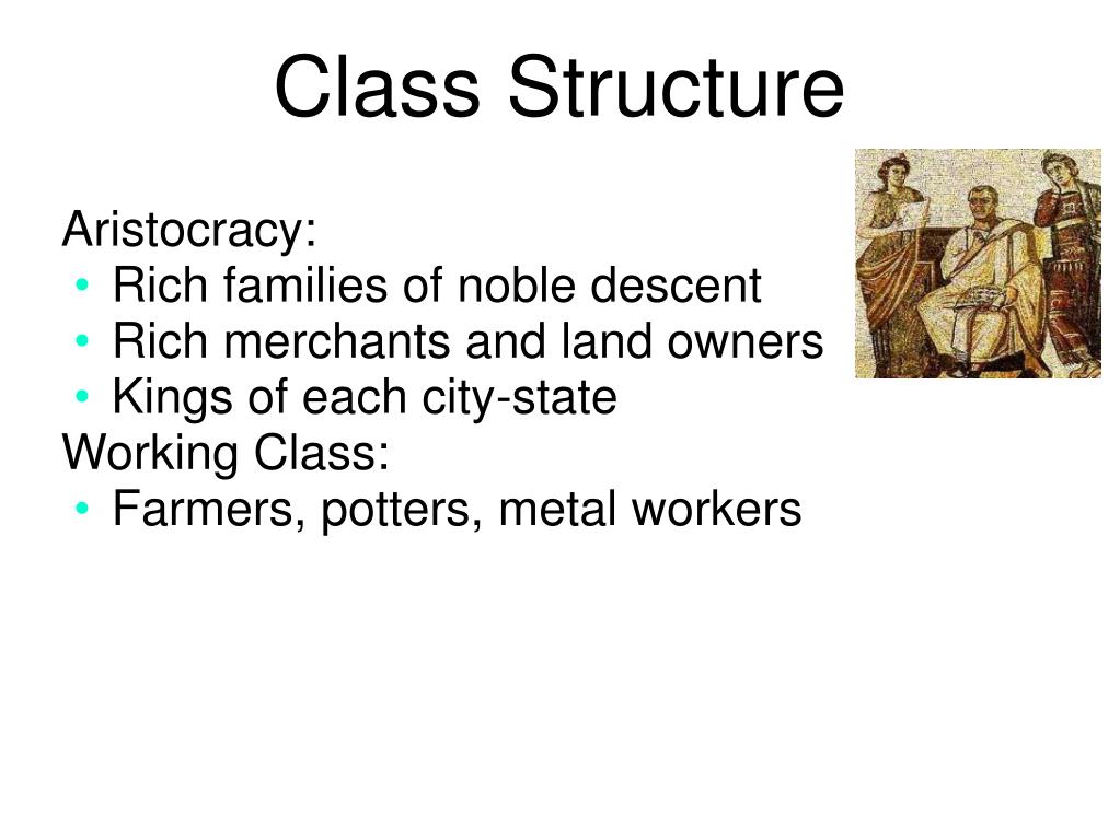 Class Structure Aristocracy: Rich families of noble descent Rich merchants and land owners Kings of each city-state Working Class: Farmers, potters, metal workers