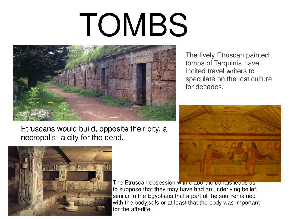 TOMBS The lively Etruscan painted tombs of Tarquinia have incited travel writers to speculate on the lost culture for decades. Etruscans would build, opposite their city, a necropolis--a city for the dead. The Etruscan obsession with elaborate burials leads us to suppose that they may have had an underlying belief, similar to the Egyptians that a part of the soul remained with the body,sdfs or at least that the body was important for the afterlife.