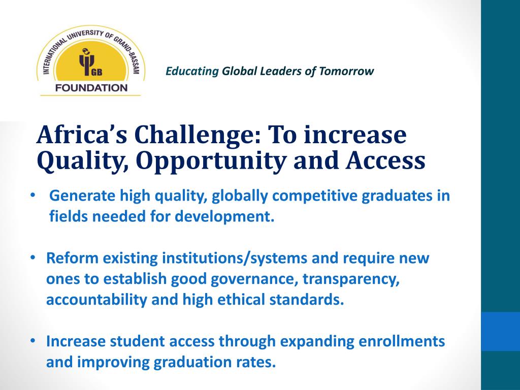 Educating Global Leaders of Tomorrow Africa’s Challenge: To increase Quality, Opportunity and Access • Generate high quality, globally competitive graduates in fields needed for development. • Reform existing institutions/systems and require new ones to establish good governance, transparency, accountability and high ethical standards. • Increase student access through expanding enrollments and improving graduation rates.