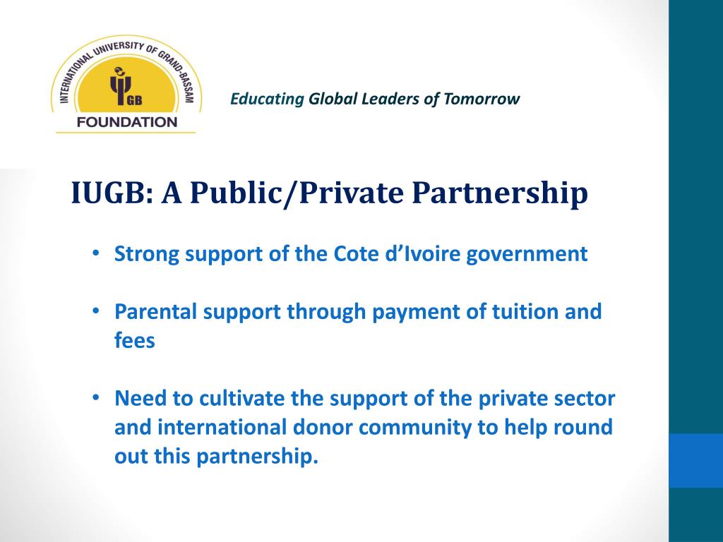 Educating Global Leaders of Tomorrow IUGB: A Public/Private Partnership • Strong support of the Cote d’Ivoire government • Parental support through payment of tuition and fees • Need to cultivate the support of the private sector and international donor community to help round out this partnership.