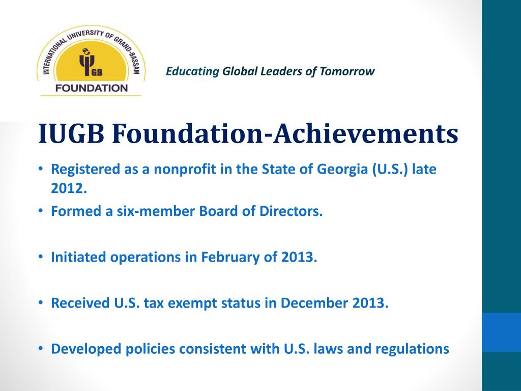 Educating Global Leaders of Tomorrow IUGB Foundation-Achievements • Registered as a nonprofit in the State of Georgia (U.S.) late 2012. • Formed a six-member Board of Directors. • Initiated operations in February of 2013. • Received U.S. tax exempt status in December 2013. • Developed policies consistent with U.S. laws and regulations