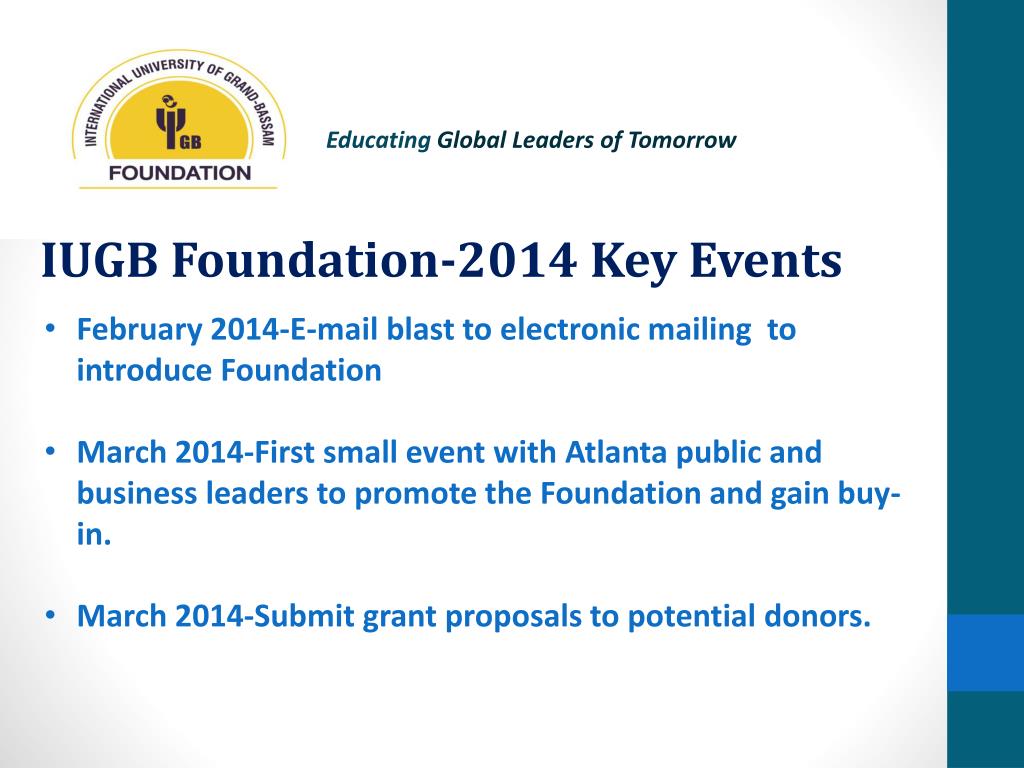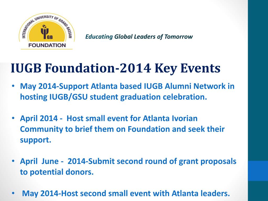 Educating Global Leaders of Tomorrow IUGB Foundation-2014 Key Events • May 2014-Support Atlanta based IUGB Alumni Network in hosting IUGB/GSU student graduation celebration. • April 2014 - Host small event for Atlanta Ivorian Community to brief them on Foundation and seek their support. • April June - 2014-Submit second round of grant proposals to potential donors. • May 2014-Host second small event with Atlanta leaders.