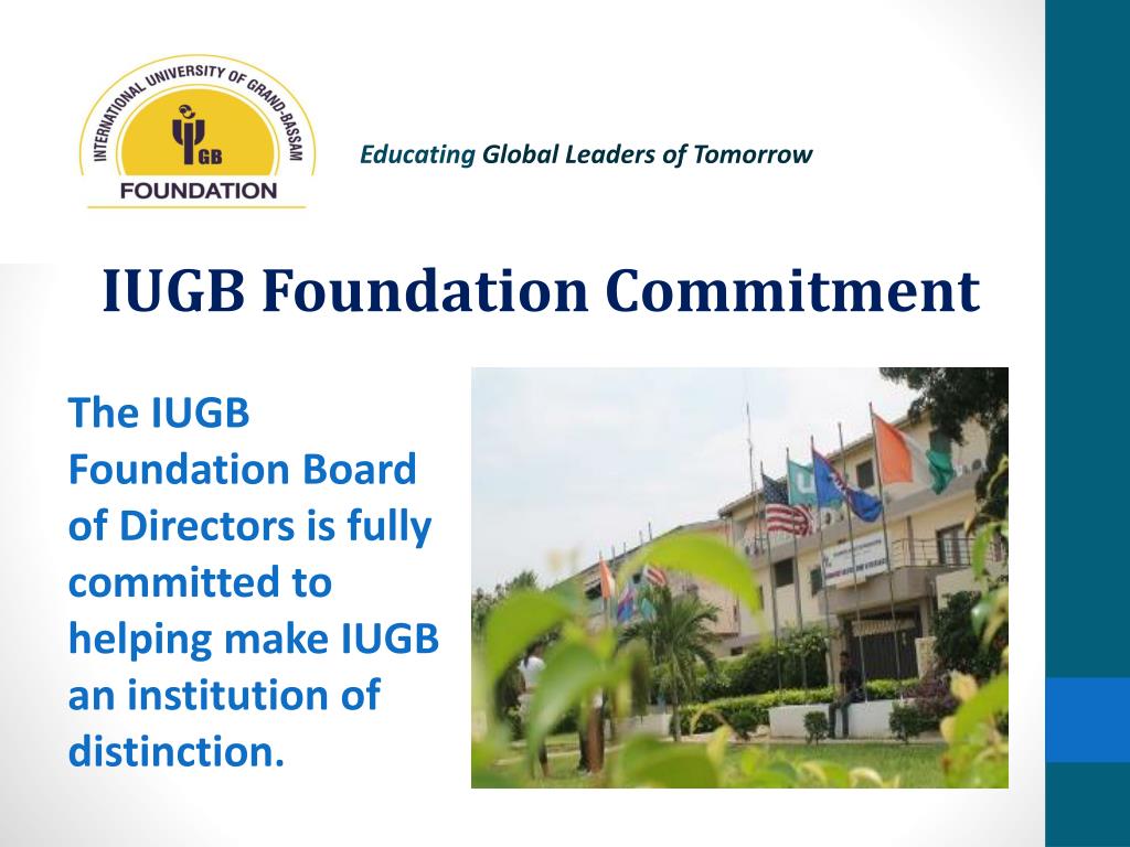 Purpose - IUGB Foundation Educating Global Leaders of Tomorrow • Education • Raise funds from private sources to assist qualified students without the financial means to attend the International University of the Grand-Bassam. • Make scholarship decisions aligned with the University’s mission and need. • Assist the University’s capacity building efforts.
