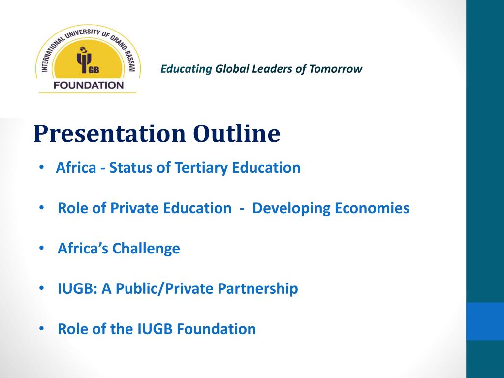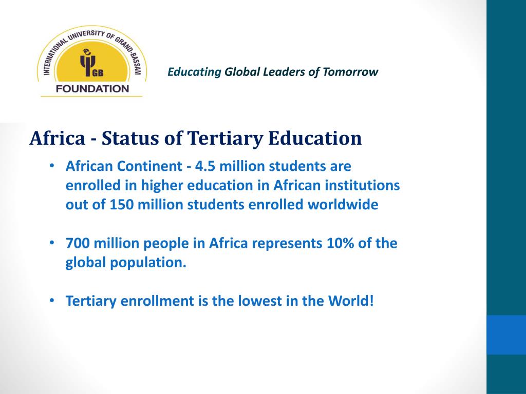 Educating Global Leaders of Tomorrow Presentation Outline • Africa - Status of Tertiary Education • Role of Private Education - Developing Economies • Africa’s Challenge • IUGB: A Public/Private Partnership • Role of the IUGB Foundation
