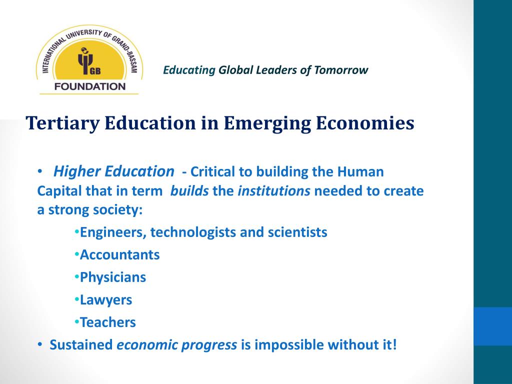 Educating Global Leaders of Tomorrow • Higher Education - Critical to building the Human Capital that in term builds the institutions needed to create a strong society: • Engineers, technologists and scientists • Accountants • Physicians • Lawyers • Teachers • Sustained economic progress is impossible without it! Tertiary Education in Emerging Economies