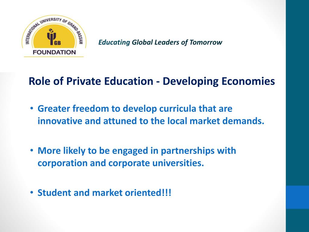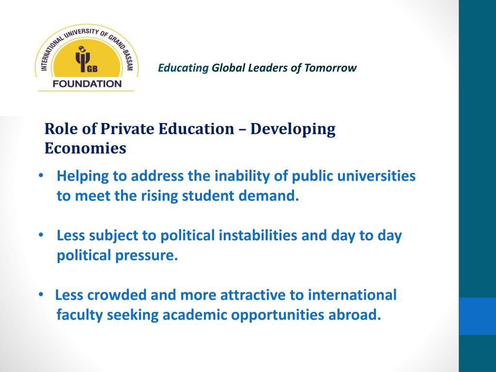 Educating Global Leaders of Tomorrow Role of Private Education – Developing Economies • Helping to address the inability of public universities to meet the rising student demand. • Less subject to political instabilities and day to day political pressure. • Less crowded and more attractive to international • faculty seeking academic opportunities abroad.