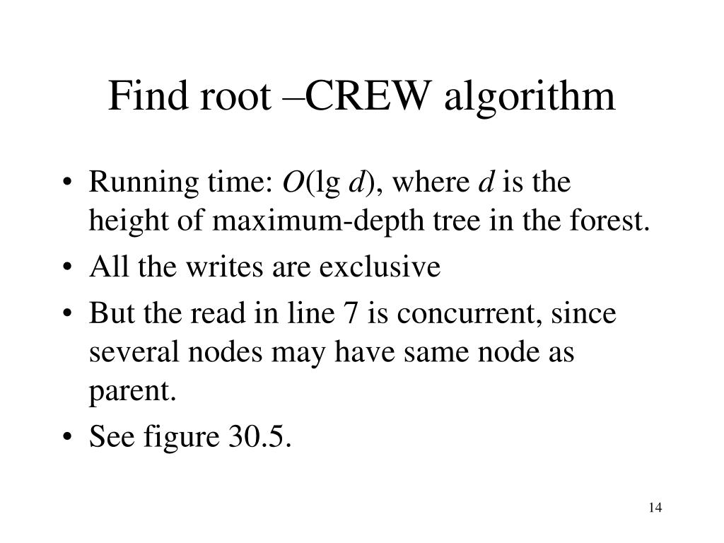 Find root –CREW algorithm • Running time: O(lg d), where d is the height of maximum-depth tree in the forest. • All the writes are exclusive • But the read in line 7 is concurrent, since several nodes may have same node as parent. • See figure 30.5.