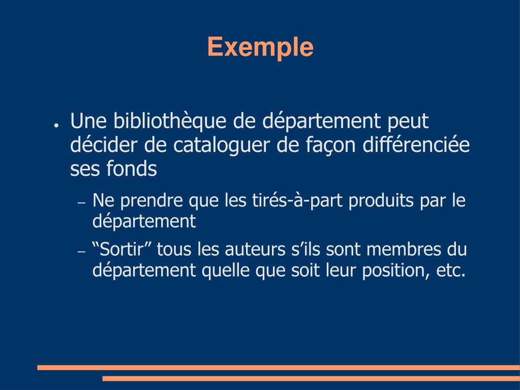 Exemple • Une bibliothèque de département peut décider de cataloguer de façon différenciée ses fonds • Ne prendre que les tirés-à-part produits par le département • “Sortir” tous les auteurs s’ils sont membres du département quelle que soit leur position, etc.