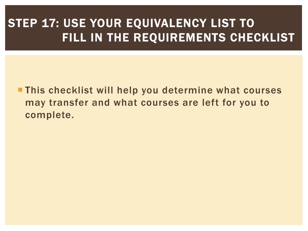Step 17: use your Equivalency List to Fill in the Requirements checklist • This checklist will help you determine what courses may transfer and what courses are left for you to complete.