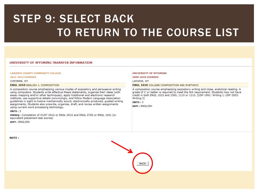 Step 5: View the course you want to evaluate for transfer Laramie County Community College University of Wyoming ** This equivalency form indicates both Organic Chemistry I and Organic Chemistry Lab I must be taken at LCCC to receive credit for UW’s Organic Chemistry I course.