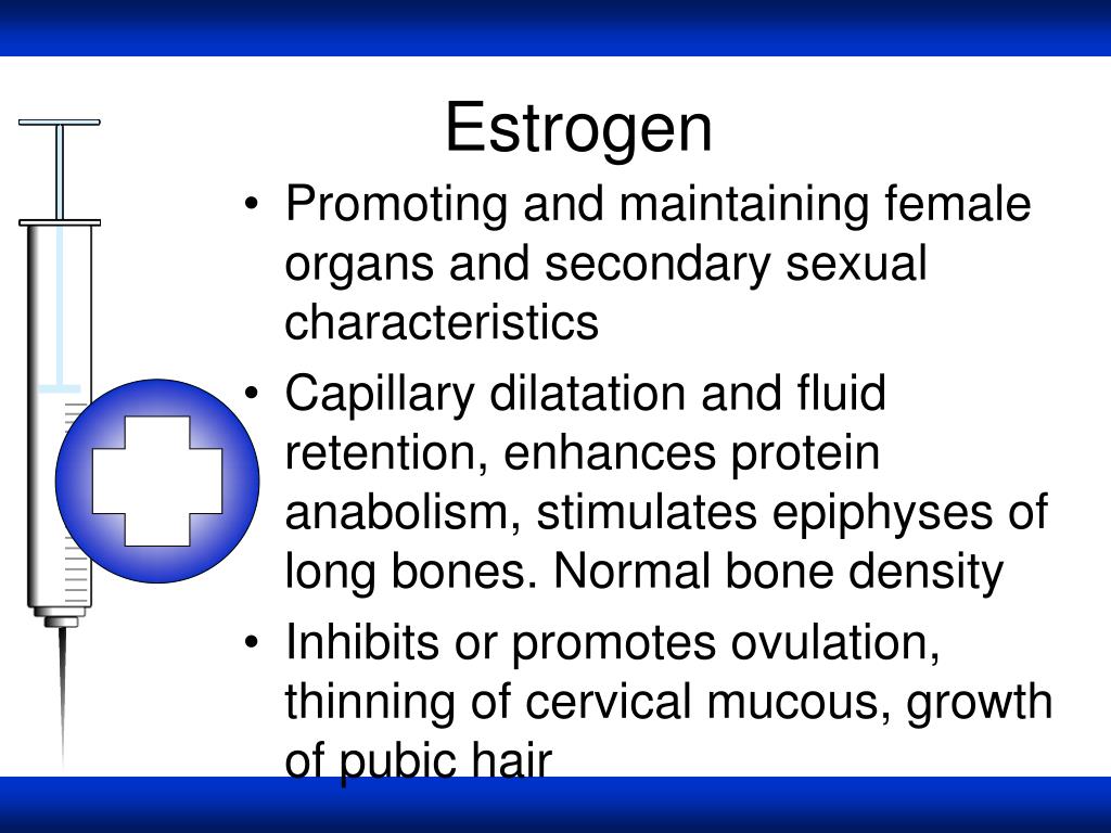 Estrogen • Promoting and maintaining female organs and secondary sexual characteristics • Capillary dilatation and fluid retention, enhances protein anabolism, stimulates epiphyses of long bones. Normal bone density • Inhibits or promotes ovulation, thinning of cervical mucous, growth of pubic hair