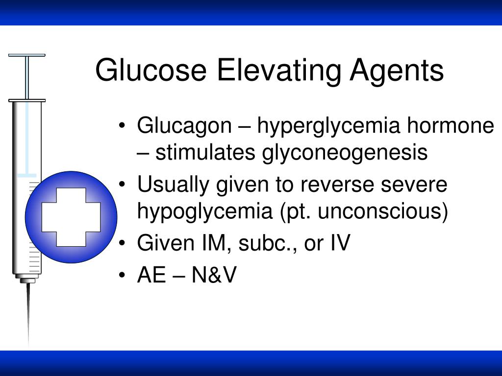 Glucose Elevating Agents • Glucagon – hyperglycemia hormone – stimulates glyconeogenesis • Usually given to reverse severe hypoglycemia (pt. unconscious) • Given IM, subc., or IV • AE – N&V