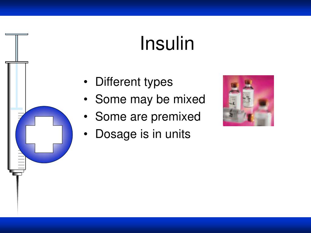 Insulin • Different types • Some may be mixed • Some are premixed • Dosage is in units
