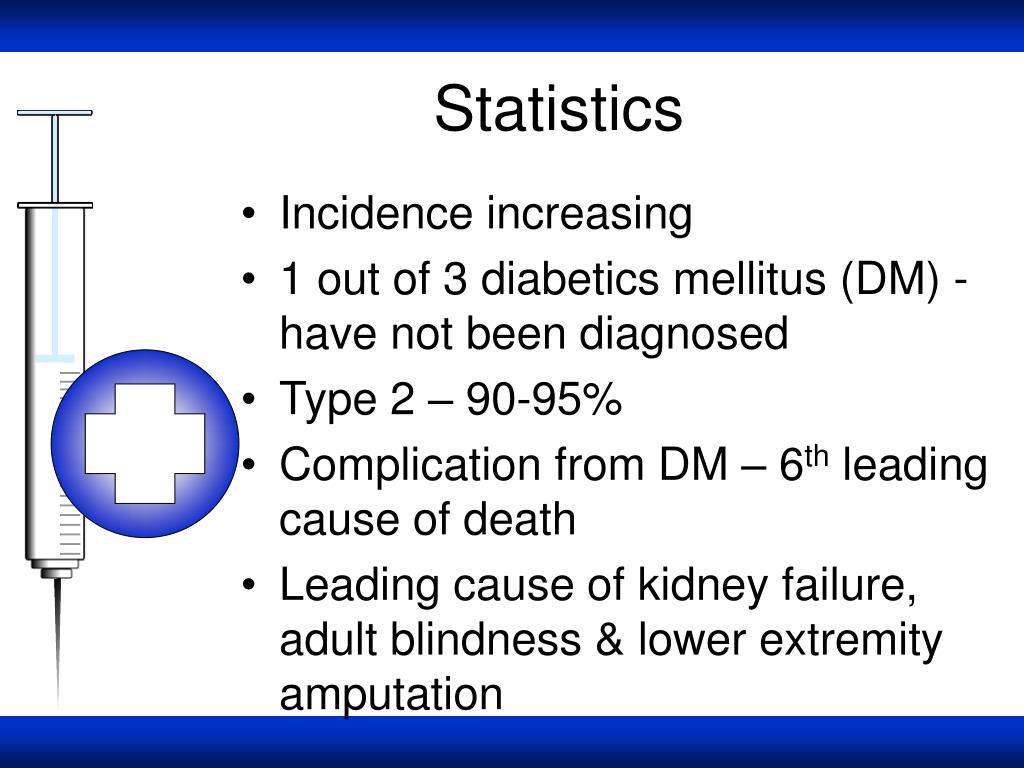 Statistics • Incidence increasing • 1 out of 3 diabetics mellitus (DM) -have not been diagnosed • Type 2 – 90-95% • Complication from DM – 6th leading cause of death • Leading cause of kidney failure, adult blindness & lower extremity amputation