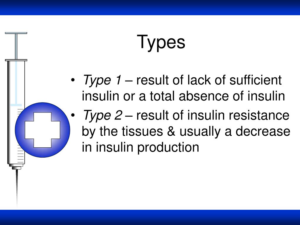 Types • Type 1 – result of lack of sufficient insulin or a total absence of insulin • Type 2 – result of insulin resistance by the tissues & usually a decrease in insulin production