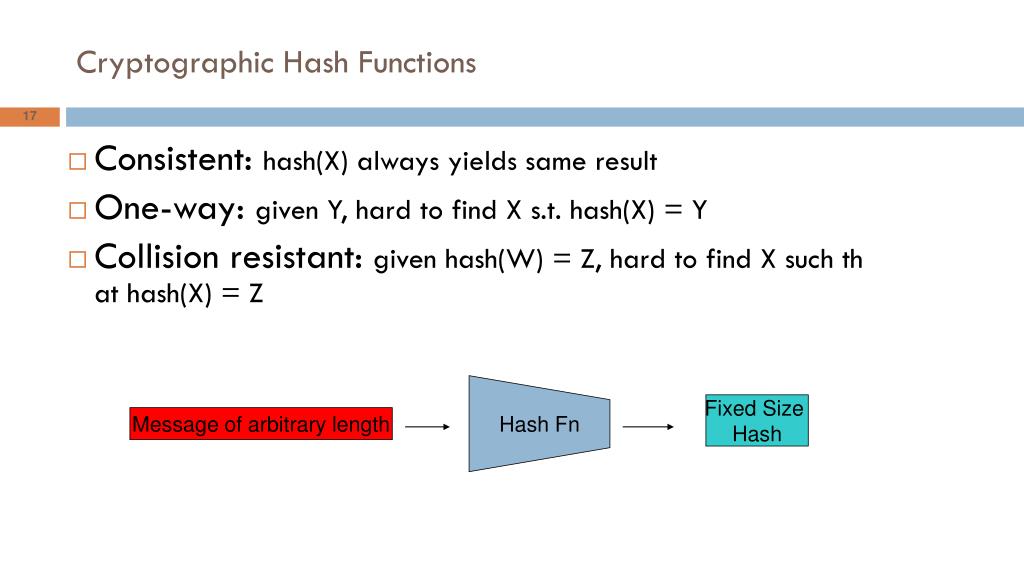 Cryptographic Hash Functions • Consistent: hash(X) always yields same result • One-way: given Y, hard tofind X s.t. hash(X) = Y • Collision resistant: given hash(W) = Z, hard tofind X such that hash(X) = Z Hash Fn Fixed Size Hash Message of arbitrary length