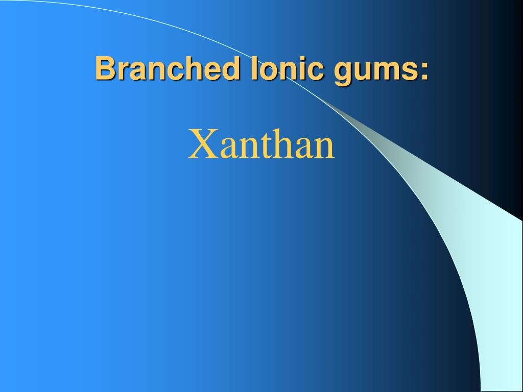 Xanthan gum • Source: Product of bacteria Xanthomonas campestris • Structure: cellulose-like backbone (b-1,4-poly-glucose) with trisaccharide branches (stubs) on alternate monomers on the backbone carrying carboxylic acid residue • Functional Properties: Water soluble, viscous, non-gelling. Viscosity is only slightly temperature dependant