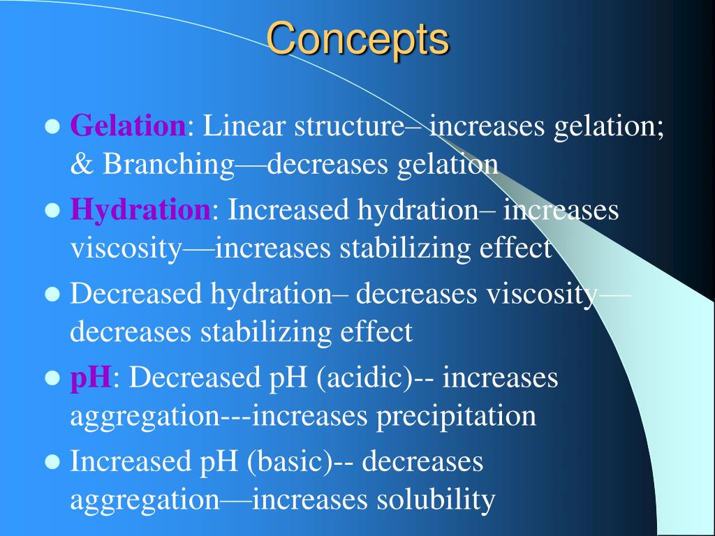 Concepts Gelation: Linear structure– increases gelation; & Branching—decreases gelation Hydration: Increased hydration– increases viscosity—increases stabilizing effect Decreased hydration– decreases viscosity—decreases stabilizing effect pH: Decreased pH (acidic)-- increases aggregation---increases precipitation Increased pH (basic)-- decreases aggregation—increases solubility